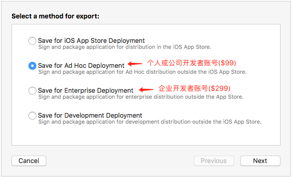 1. 如果是($99)个人或公司苹果开发者账号,请选择 “Save for Ad Hoc Deployment”