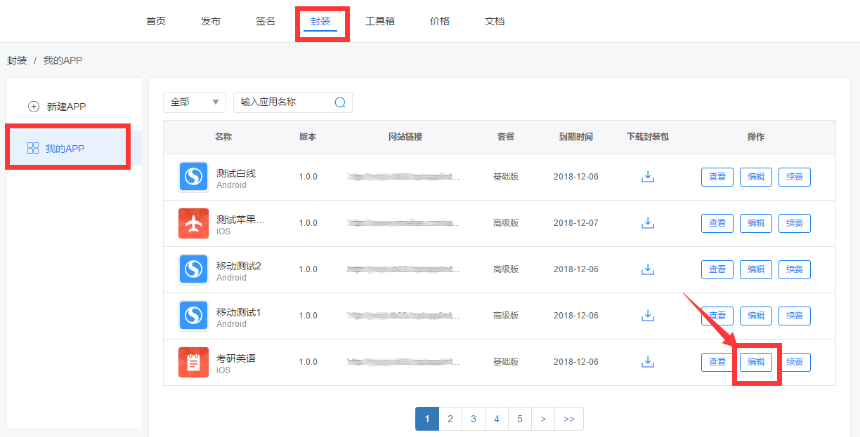 在【封装-我的APP】中,点击右侧按钮【编辑】,即可重新选择如下图所示: